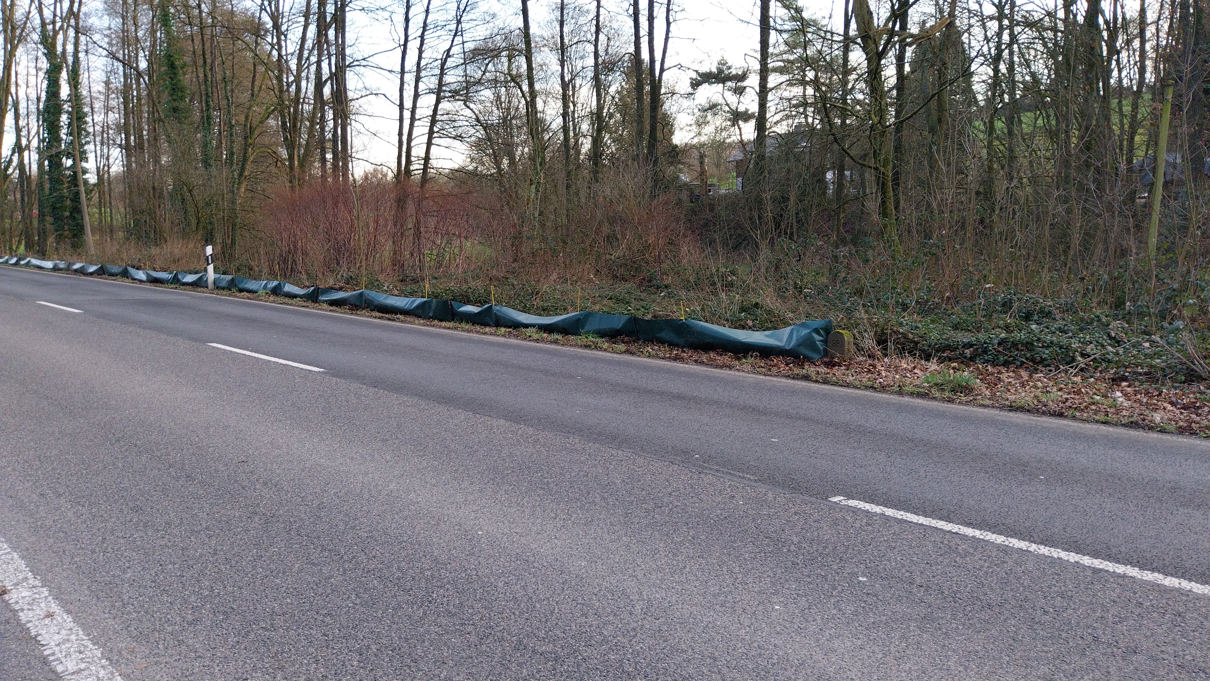 Seit 2023 wurde dort die wanderende Krötenpopulation erfasst und dokumentiert. Zu diesem Zeitpunkt noch ohne Schutzzaun und Eimer. Das Sammeln der Individuen gestaltete sich als sehr gefährlich, weshalb zum einen zum Schutz der Amphibien, zum anderen zum Schurtz der Helfer in 2024 ein Zaun mit Hilfe des UNB und der freiwilligen NABU-Helfer und Frau Sandra Sons errichtet wurde. Dieser wurde sukzessive in 2025 erweitert und mit selbst gekauftem Zaumaterial in 2026 nochmals verlängert.
