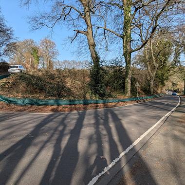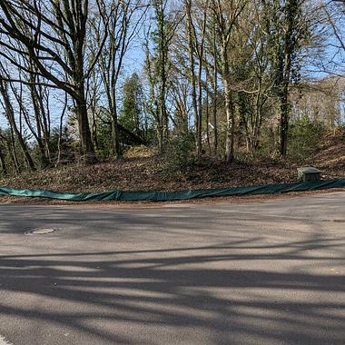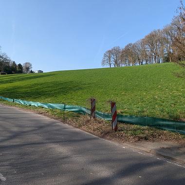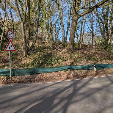 Der Zaun liegt auf der nördlichen Seite der Kotzerter Straße, eine viel befahrene Straße von Solingen über Haan zur Autobahn, Tempo 30, Engpass mit einspurigem Begegnungsverkehr.